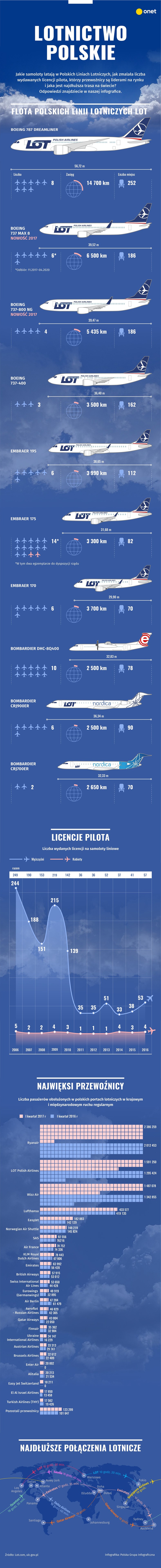 Wielkie samoloty i najwięksi przewoźnicy na polskim niebie. Zobacz, jakie maszyny ma w swoim posiadaniu LOT, jaka jest najdłuższa trasa lotnicza na świecie, a jaka polskiej linii lotniczej. Zobacz także, ile licencji pilotów wydaje się rocznie w Polsce.